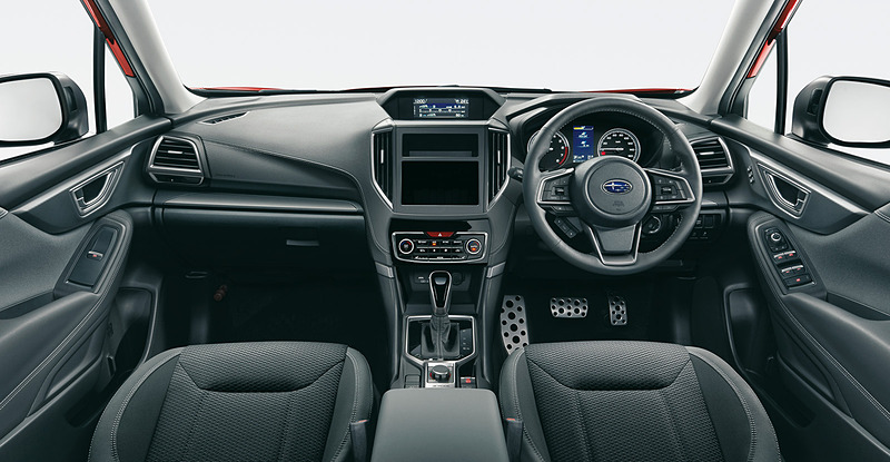 新型フォレスターの室内空間は、SUVならではの力強さやゆとりと開放感を表現するために、インストゥルメントパネルとコンソールを連続させるなどの工夫がなされている。